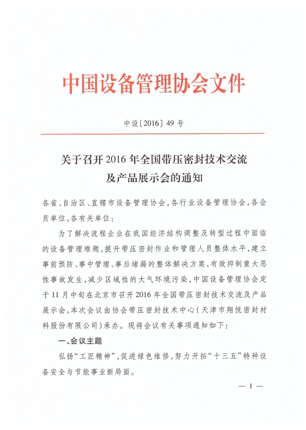 關(guān)于召開2016年全國(guó)帶壓密封技術(shù)交流及產(chǎn)品展示會(huì)的通知